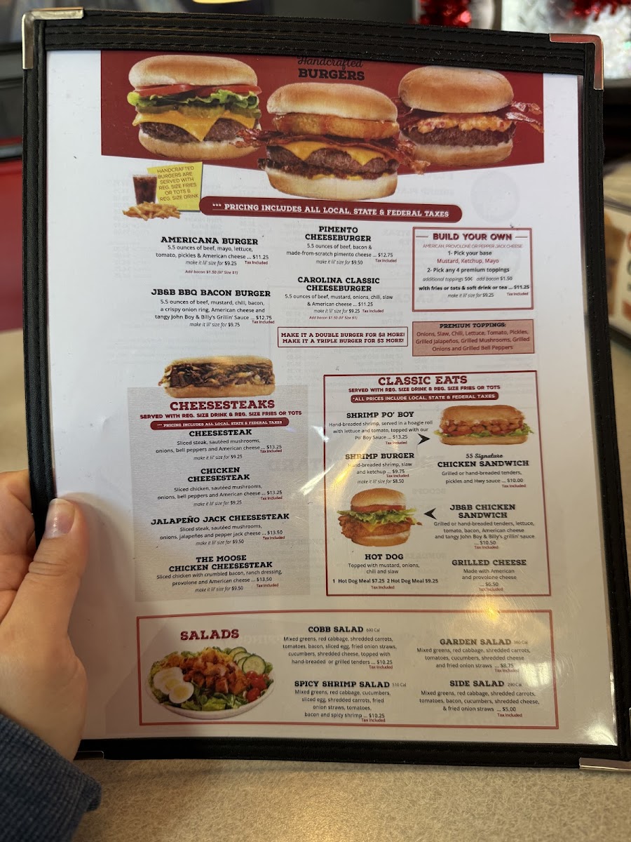 Andy's Size is 1/3 pound of burger! Topped with your choice of American, provolone, or pepper jack cheese, mustard chili, bacon, a crispy onion ring, and tangy John Boy and Billy's Grillin' Sauce. All hand-crafted burgers are served with fries or tots and a soft drink or tea.