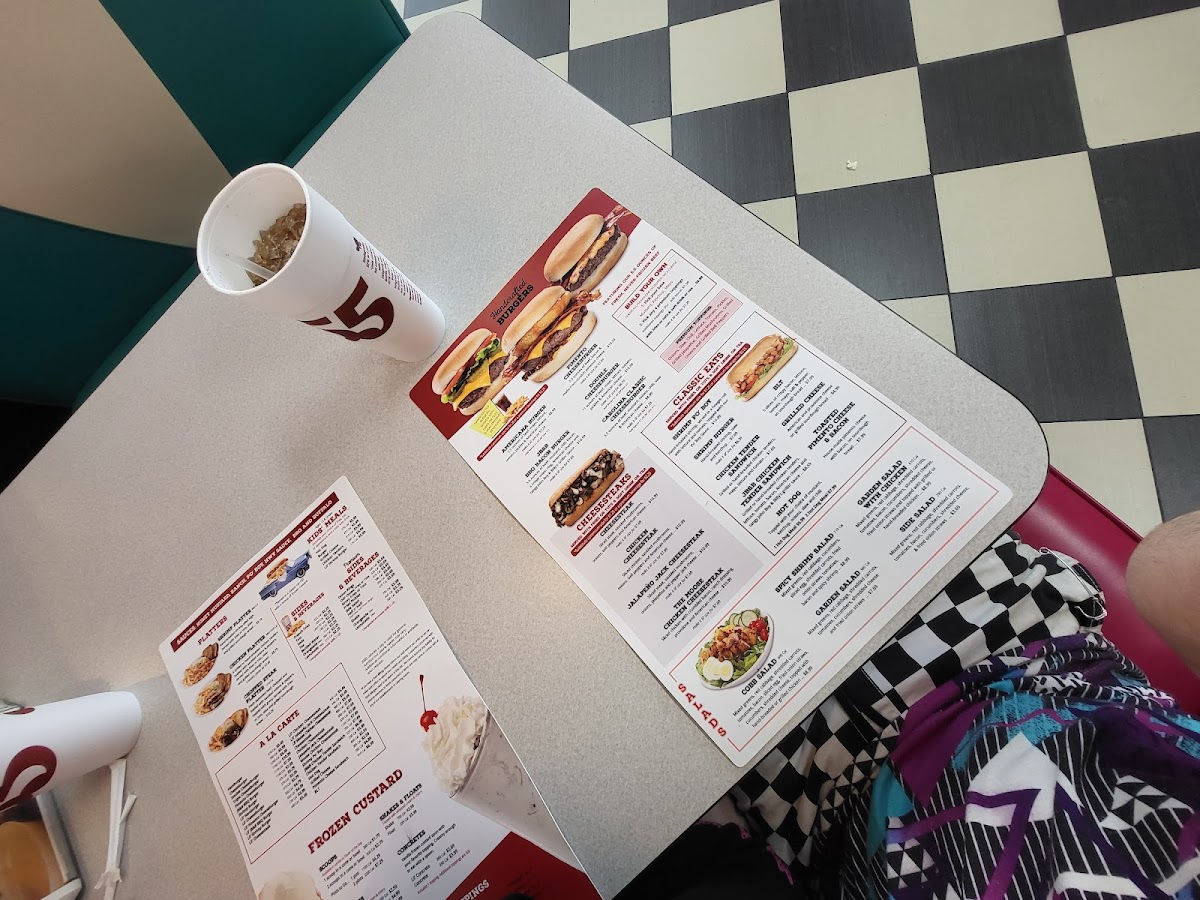 Hot dog with your choice of fries, tots or applesauce and a soft drink or tea. Served in a classic car OR with a scoop of frozen custard.
